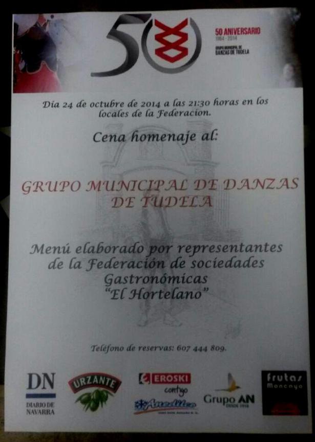 Mañana día 24 de Octubre va a tener lugar la cena-homenaje que la Federación de Sociedades Gastronómicas "El Hortelano" le ofrece al Grupo Municipal de Danzas de Tudela por su 50 Aniversario.